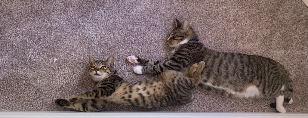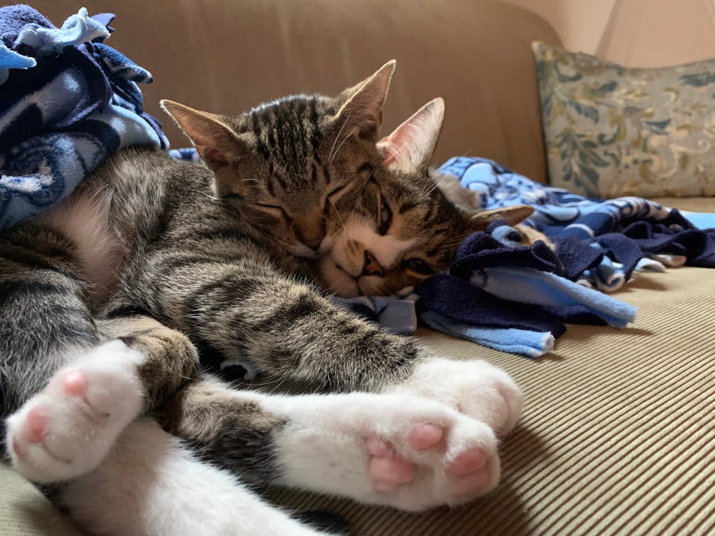 Even though they were not truly brothers, they hit it off right away. So many people remarked how they had never seen two cats, related or not, love on each other like they did. They helped bathe each other, but most adorably, they took naps together, cuddled up in a ball. Our hearts melted every time.